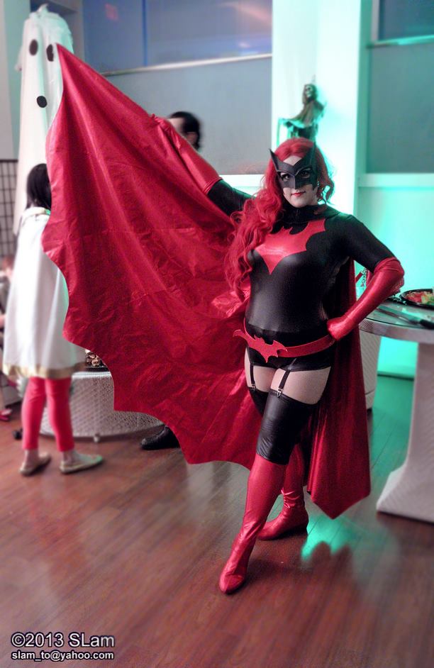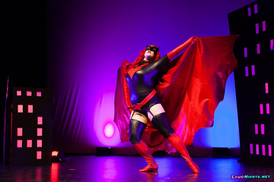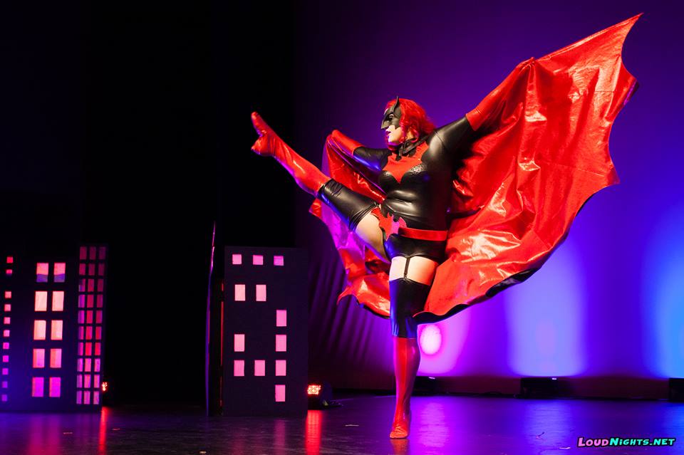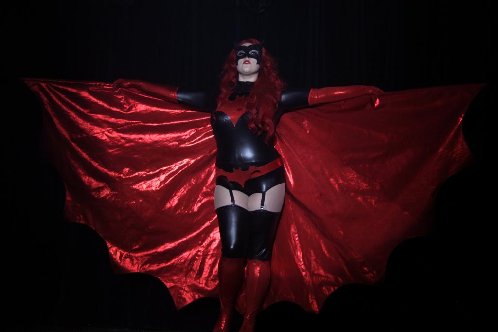 A few weeks ago I was so lucky to perform in the Nerdlesque Festival in New York city as the vibrant superhero Batwoman. Not Batgirl… Batwoman. I also performed this act at Peepshow TO’s Nude 52 show last October. I thought I would share some of the photos from these events of the epic costume I put together for this act. This is another example of Burlesque Cosplay, where slight modifications are made to help with the removal of each item. Instead of having one full bodysuit I decided to cut out the thighs and put in garters. I also made the boots into bootcovers that are removed like stockings with a simple nude dance shoe underneath. The most fantastic part of this costume though is the cape! This thing is a monster that stretches past my reach and has dowels sewn in to help me hold it up. But my absolute favourite part of the costume in my amazing mask which is leather and was made for me by the brilliant leatherworker and costume designer Adam Smith! I love the way this costume turned out and I have found each time I wear it that there are a lot of Batwoman fans out there that appreciate the outcome of my effort and love seeing this fierce, Jewish, lesbian badass hero come to life!