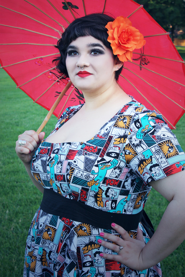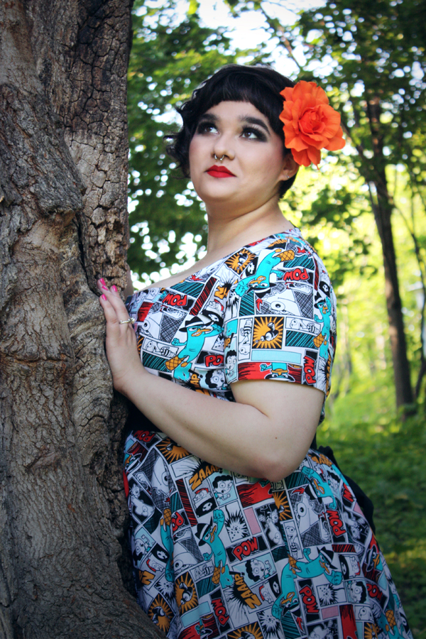 While out fabric shopping together Sam spotted this amazing cartoon printed fabric with characters from the show Phineas and Ferb and instantly fell in love with it. We decided it would be the perfect print for a new summer dress! The colours in this fabric are fantastic and the comic book window style with graphic text and action posed characters bring so much life to it. Because of the loud fabric we kept the design simple on this one. Just a plain black sash with bow at the back and a short t-shirt sleeve. Sam looks stunning in this creation!