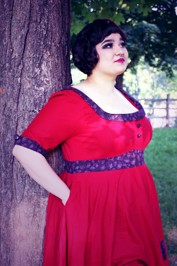 This red dress was the first one I created for Sam. We began with the trim fabric, which is a delectable blackberry print, and then matched the red highlight in the print with a red fabric for the main body of the dress. I love the way the rich red and the purple blackberries balance each other. The cuffs on the sleeves have a little wing with a button that matches the buttons on the bust area. This dress also has some sweet pockets to keep your cell phone and your lipstick in! At the hem of the dress I added a couple of blackberry hearts and matched them on the fascinator that I also made to add to this look.