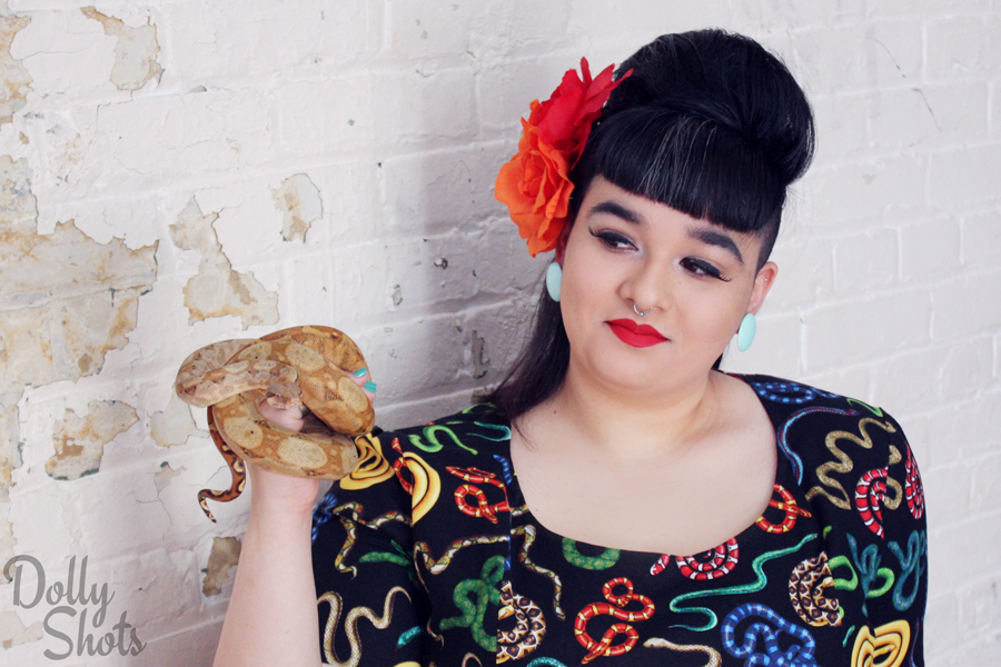 This week’s beauty is provided by my dear friend Sam! I love making custom dresses for Sam, as you can see from some previous posts. On our most recent fabric shopping excursion we were able to find two amazing prints, the first of which turned into this dress. Sam has a love of snakes and owns two of her own named Rosie and JB. JB decided to join us for this photoshoot to compliment the slithering snake printed dress. I’ve also included some behind-the-scenes photos in today’s post provided by Tyrone Islington. Enjoy!