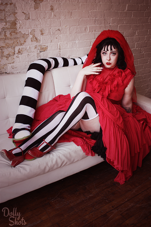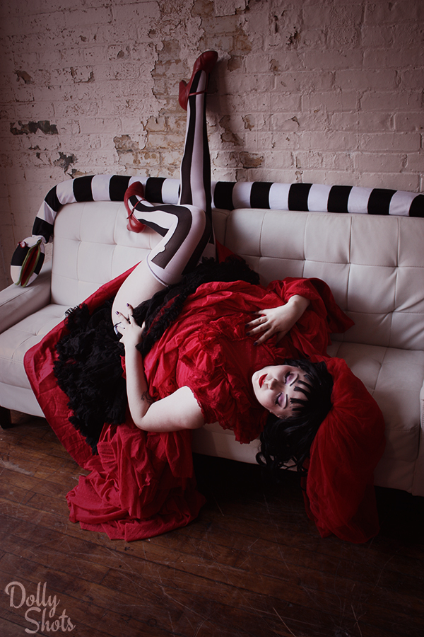 Burlesque performer and Co-Producer of Peepshow TO, Betty Quirk has been thrilling audiences with one of her signature acts as Lydia Deetz from Beetlejuice. I finally had the chance recently to capture some photos of her in this phenomenal costume with her Sand Worm hand puppet. If you want to see Betty perform this act and others, you can catch in her Yellowknife on Halloween at the Movie Madness Burlesque Show. Now please enjoy these photos of Betty Quirk as Lydia Deetz!