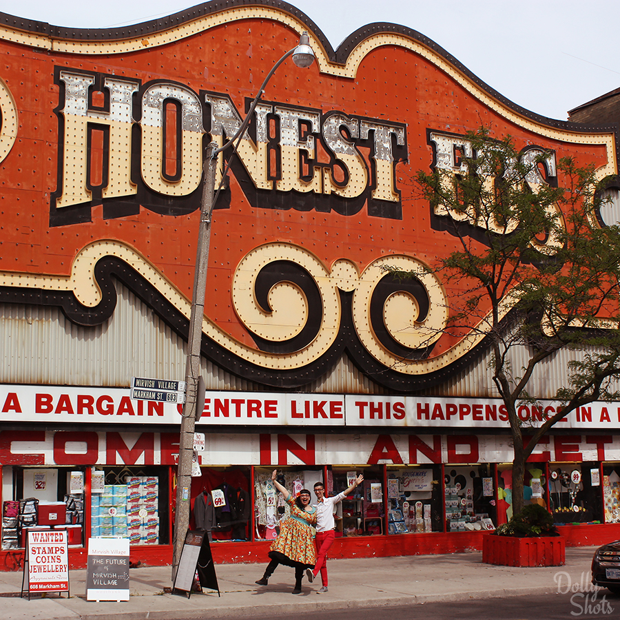 I can barely remember when I first met Sam and Trevor because it feels like we’ve known each other forever. I do, however, remember that upon being told of their engagement I was quite surprised since I had no idea they were even dating! This pair has always been quite private about their relationship, which, in a world where all our interactions are broadcast online, is quite a rare thing. Knowing all that, how lucky am I to have been invited to snap some shots of this lovely couple being publicly romantic for their engagement photos?! These photos are even more special since they were taken at Honest Eds, a cherished Toronto landmark which will see its demise at the end of this year.