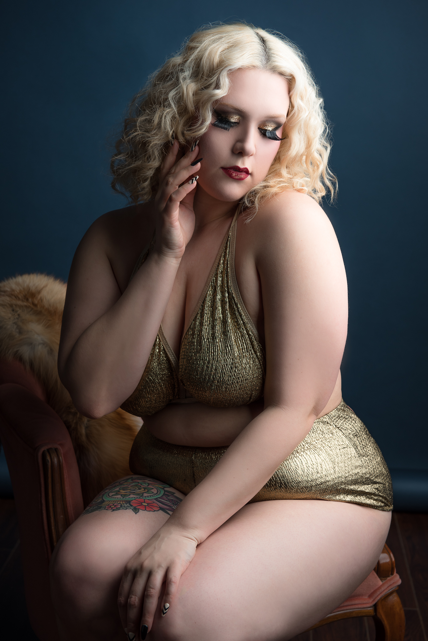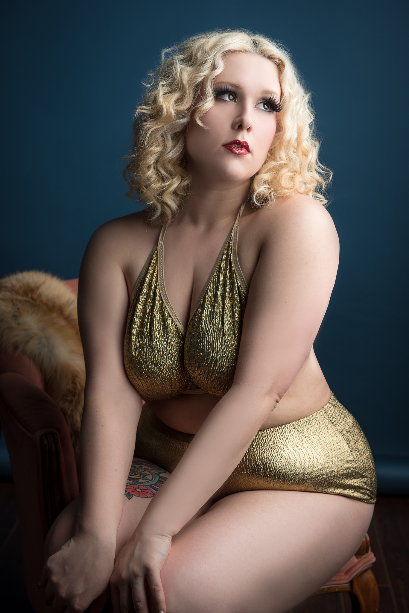 More amazing photos from the uber talented Rebecca Northcott Photography! Keeping with the 1970s theme, I am rocking another Dolly Monroe original look in this gold bikini. Enjoy!