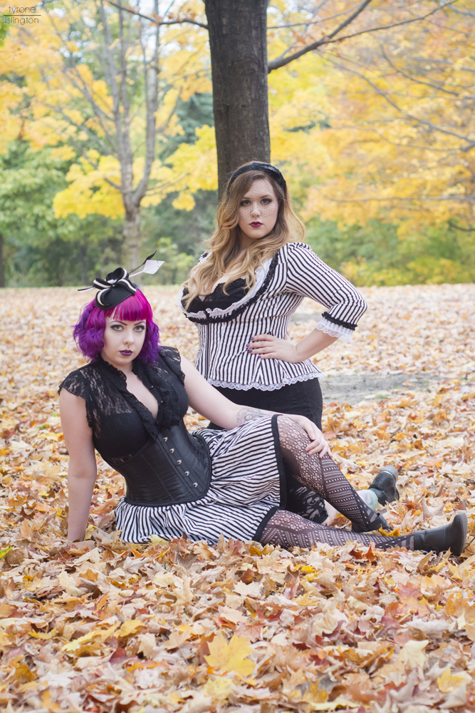 Last weekend my best bud Betty Quirk and I had a stroll through High Park with the lovely photographer Tyrone Islington and my amazing assistant Val! The lovely fall leaves were the perfect setting for a little spooky, halloween inspired shoot. The jacket I am wearing was a costume piece I made a few years ago for a burlesque routine and the skirt Betty is wearing I made for her with the left over material. Betty and I are no strangers to dressing in co-ordinating outfits and I love the way these two looks compliment each other. Enjoy our halloween pinup photos and have a very scary Halloween!